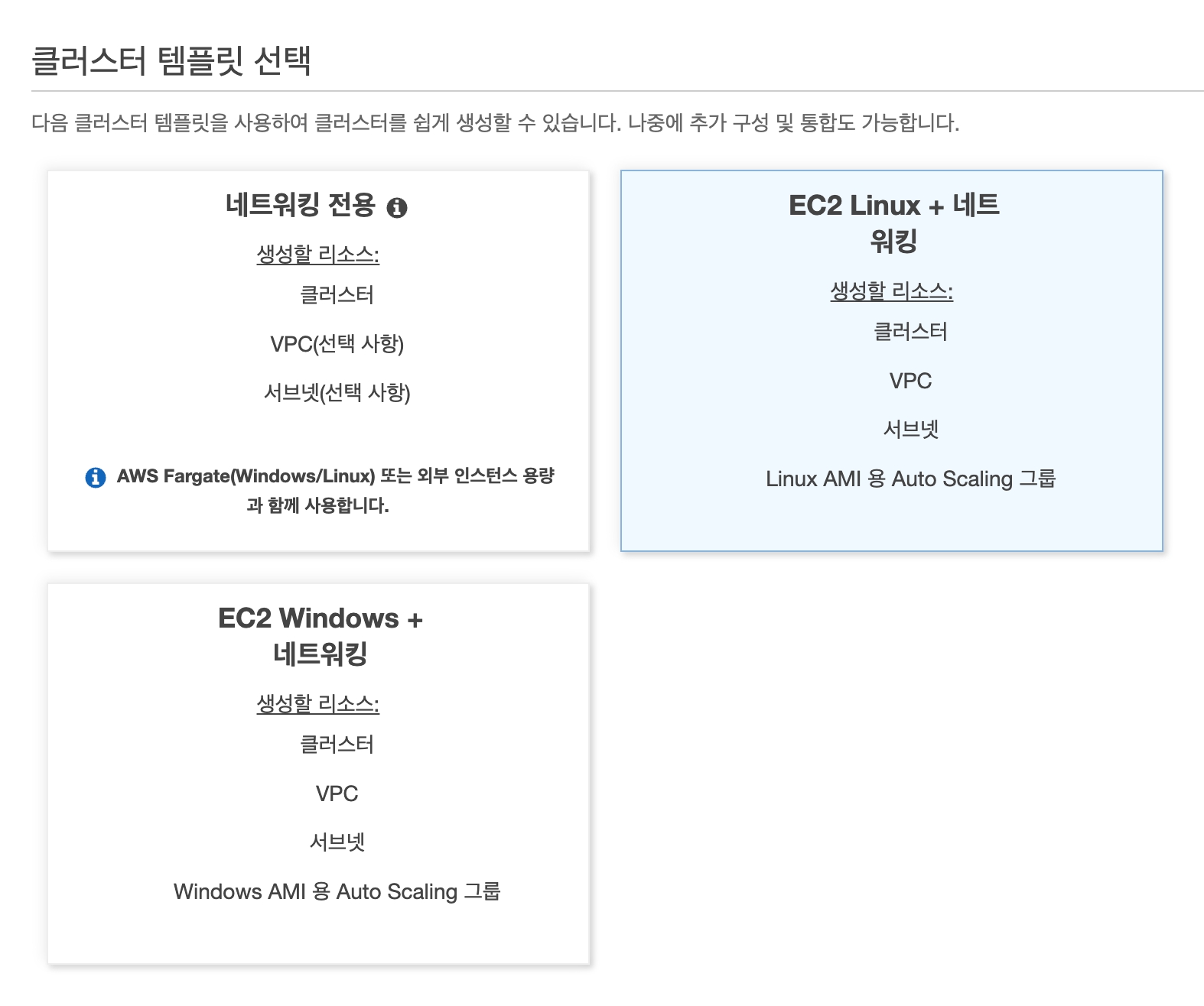 우리는 EC2로 만들것이니까 EC2 선택 (Fargate가 더 편하지만.. EC2가 프리티어를 지원해주기 때문에 ec2를 선택했다)