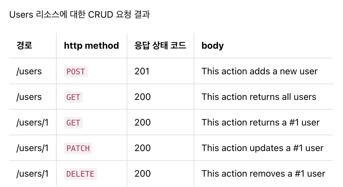 Nest는 CRUD에 대한 http method의 성공에 대한 응답으로 POST는 201, 그 외에는 200을 갖는다.