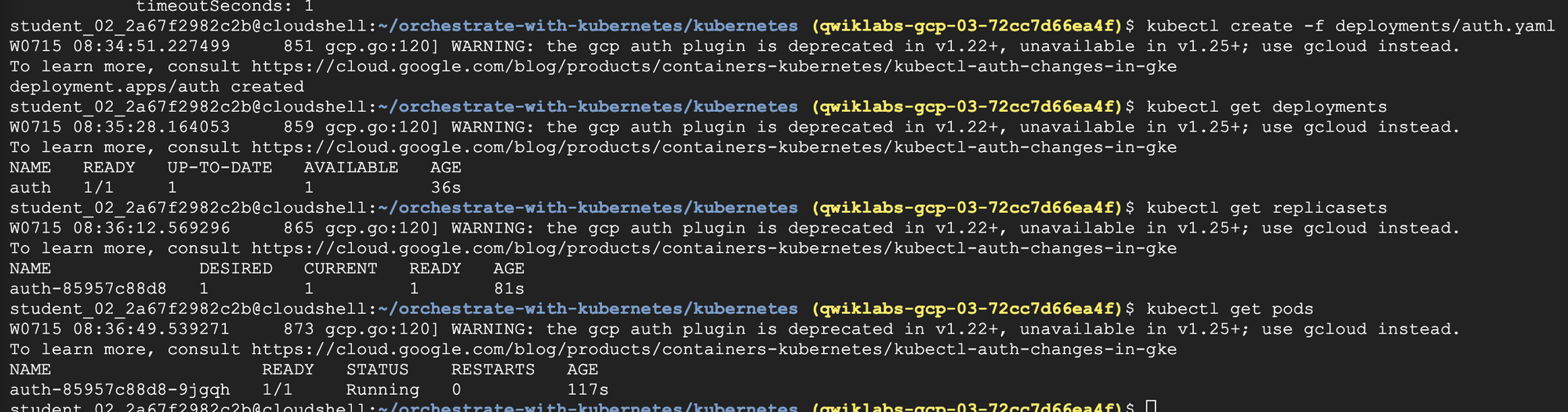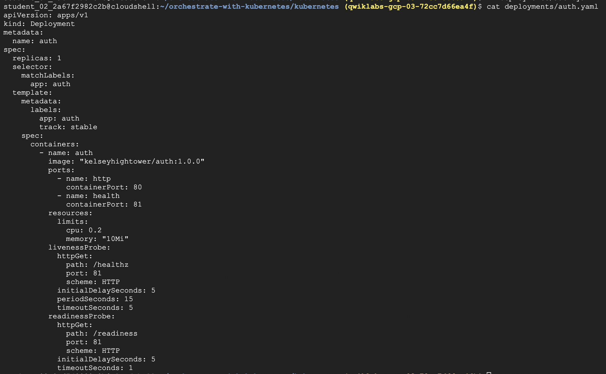 When you run the kubectl create command to create the auth deployment, it will make one pod that conforms to the data in the Deployment manifest. This means we can scale the number of Pods by changing the number specified in the replicas field.