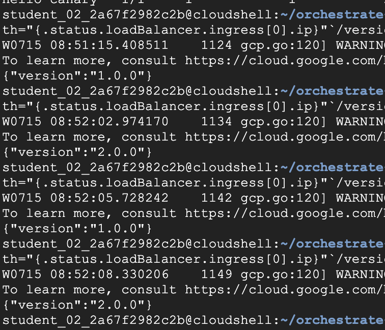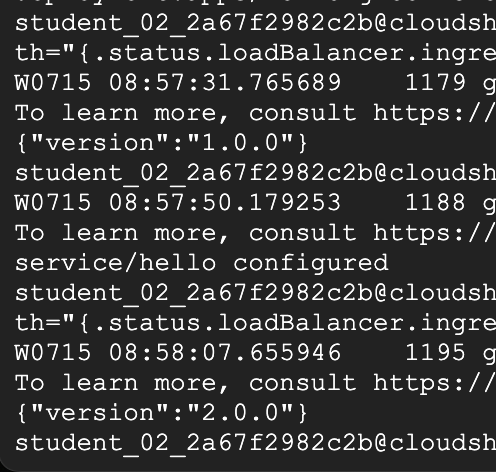 Run this several times and you should see that some of the requests are served by hello 1.0.0 and a small subset (1/4 = 25%) are served by 2.0.0.