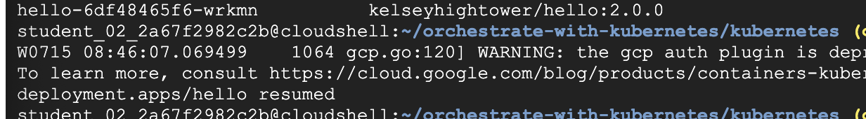 The rollout is paused which means that some pods are at the new version and some pods are at the older version. We can continue the rollout using the resume command.