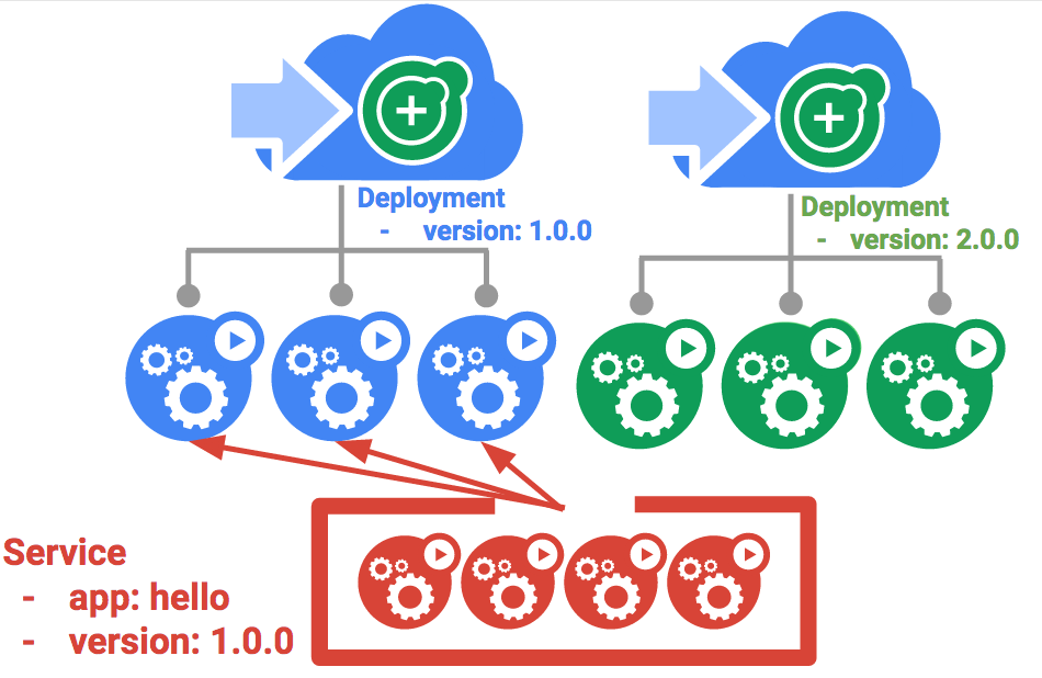 Use the existing hello service, but update it so that it has a selector app:hello , version: 1.0.0 . The selector will match the existing "blue" deployment. But it will not match the "green" deployment because it will use a different version.