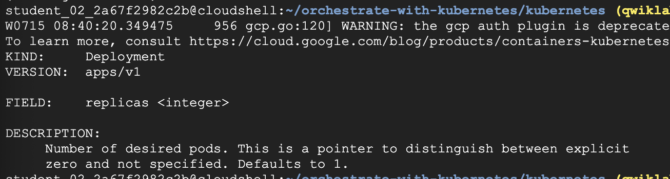 You can use the explain command as you go through the lab to help you understand the structure of a Deployment object and understand what the individual fields do.
