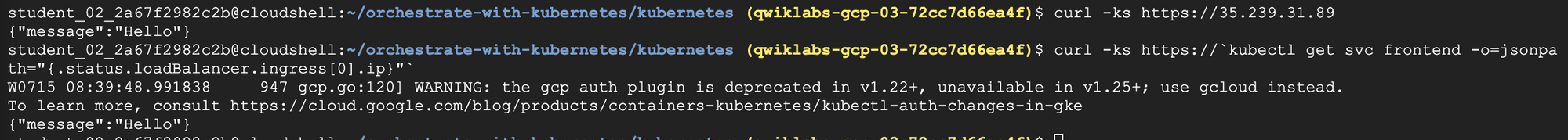 Interact with the frontend by grabbing its external IP and then curling to it.